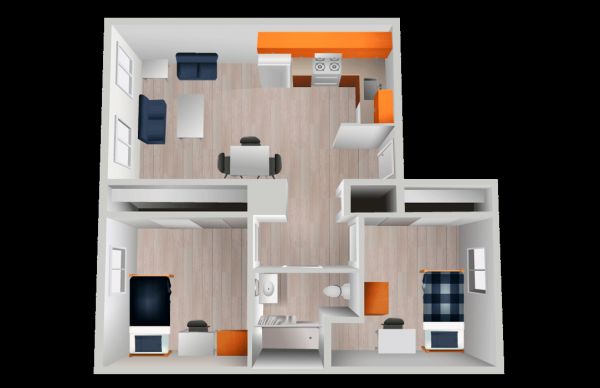 South Village Apartments offers apartment-style living for juniors, seniors, graduate students, international students, and some family housing residents. Located at south campus, the property includes thirteen buildings surrounded by forested areas with walking paths. Each unit houses two students in private bedrooms with shared common areas.